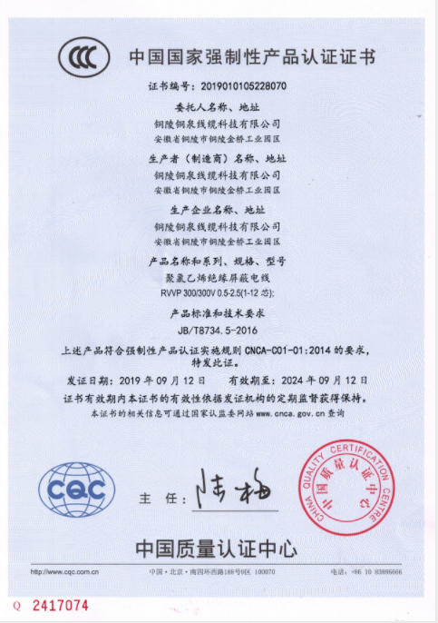 RVVP電線3C認(rèn)證證書(shū)